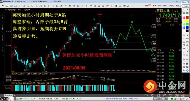 英镑加元小时波浪预测图。英镑加元小时周期处于A浪调整末端,内部子浪3与5背离迹象明显,短期将开启B浪反弹走势。