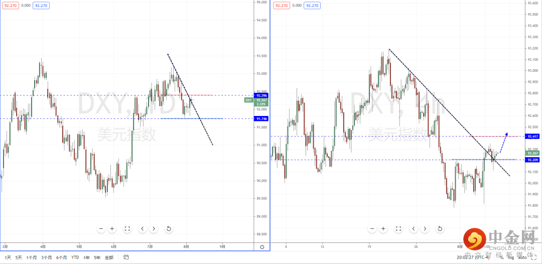 美元指数天图: 短期价格继续在冲击关键区域,下降趋势线有被突破迹象,但上方水平压制带在92.396附近。从日内4小时级别,价格在突破压制后也再次回测起稳,可适当关注价格调整后继续上行的多头机会,由于晚间有美国非农就业数据影响,需要注意趋势的动能与力度,上方目标位置参考92.417附近。