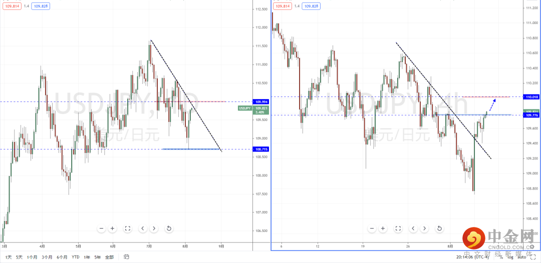美日天图:短期价格在下方有效测试支撑带108.715附近后强势上行反弹,但上方下降趋势线的压制作用,以及水平压制带在109.994附近。从日内4小时级别,由于趋势继续处于在反弹阶段中,可适当关注价格调整后继续上行机会,上方目标位置参考110.018一带。