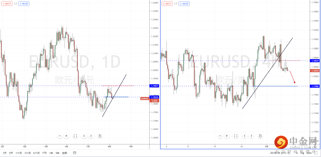 欧美天图:目前行情继续受到美元指数的影响,使得欧美承压下行。上方水平压制带在1.19077附近,同时也有跌破上升趋势线的迹象。从日内4小时级别,价格在短期回测上方压制带1.18539附近受阻,可适当关注价格调整后继续走弱的空头机会,下方目标位置参考1.17986一带