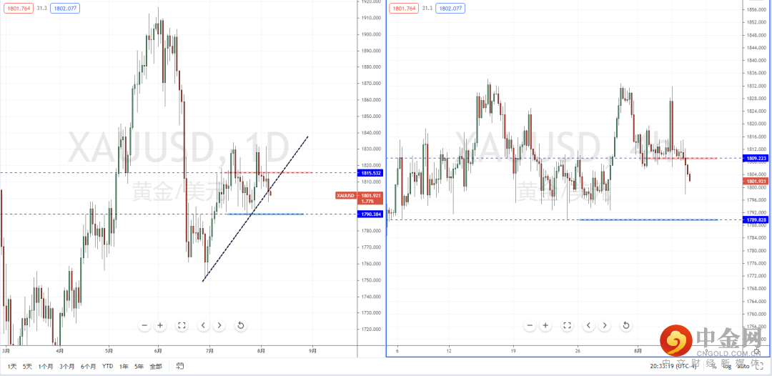 黄金天图:目前行情在上方水平压制带1815.532附近承压后继续破位下行,并且有效跌破上升趋势线,现阶段空头格局已经形成。从日内4小时级别,价格坚决破位,可适当关注价格调整后继续走弱的空头机会,下方目标位置参考1789.828一带。