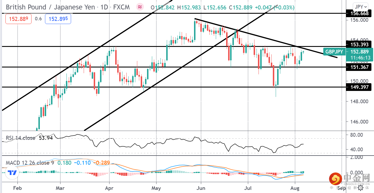 目前,英镑兑日元仍受到年初至今高点和 153.39 水平的看跌趋势线的限制。由于 MACD 和 RSI 看涨,此处仍有上涨空间,突破 153.39 水平,接下来将焦点转向 156.66 水平。不利的一面是,跌破 151.36 水平将使焦点放在 149.39 水平的更深支撑上。