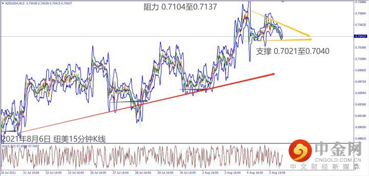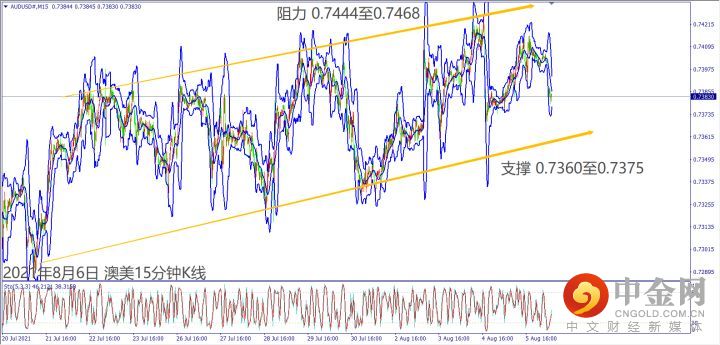 日级别线图,突破盘整顶部守在5日均线上方整理,一旦突破0.7400关口,有望启动涨势;15分钟K线,短线出现上升矩形,守住上升趋势线,可能挑战上方阻力。