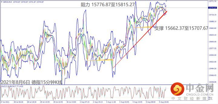日级别线图,连续上涨突破盘整顶部,移动均线多方排列,有望创波段新高;15分钟K线,短线出现盘涨,守住上升趋势线,有机会突破前高阻力。
