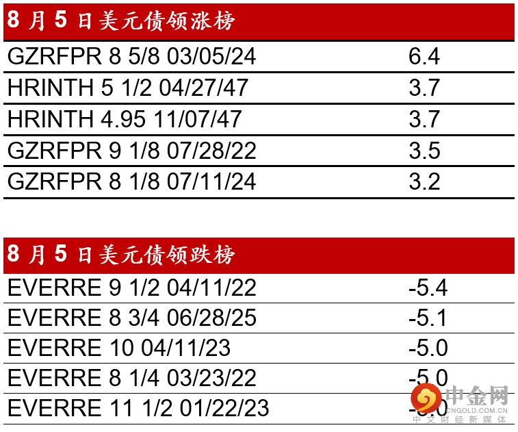 昨天(8月5日)早上中国高收益美元债券市场延续了前天的涨势,恒大和佳兆业皆上涨1-2pts。然而下午因为恒大民事诉讼案件将集中管辖的传闻导致市场再度下跌,恒大债券价格跌约3-5pts,佳兆业转跌,较前天收跌约2pts,融创亦下跌1-2pts。富力和禹洲仍维持涨幅,收涨约2-3pts。其余地产如时代/新城/建业债券整体约下跌0.25-0.75pt。晚上标普再下调恒大评级至CCC(穆迪/惠誉评级:Caa1/CCC+),整体市场情绪转弱。