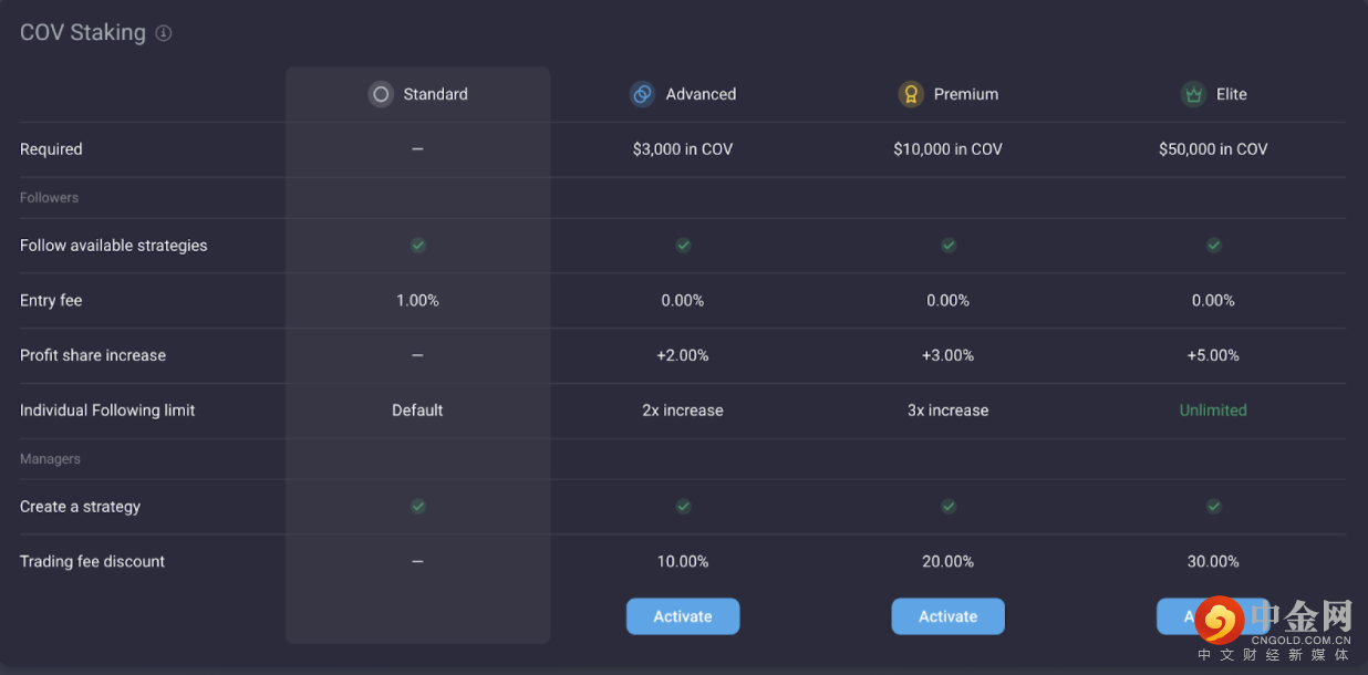 通过使用 COV 代币,用户可以在 盛币网(PrimeXBT)上将标准帐户变成高级、高级或精英帐户。所有三个级别都消除了 1% 的新关注费用,而其余功能则逐级不同。