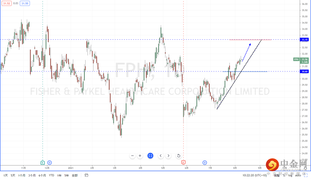 FPH:由于近期市场环境趋于走缓,并且各产业也处于在分化阶段中,产业涨跌轮替频繁。从FPH整体趋势现阶段处于在多头阶段中,下方有上升趋势线的支撑作用。并且价格在回测支撑带30.60附近起稳后继续上行,短期可关注价格调整后继续上行的多头机会,上方目标位置参考33.15一带。