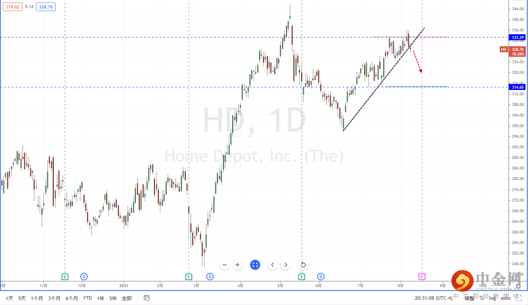 HD:现阶段由于市场节奏放缓,从HD目前整体趋势在前期冲击上方压制带333.29附近受阻下行,并且也在前期关键压制区域再次形成头部状态。短期价格也有效跌破上升趋势线的支撑作用。近期可适当关注价格调整后继续走弱的空头机会,下方区间目标位置参考314.65附近。