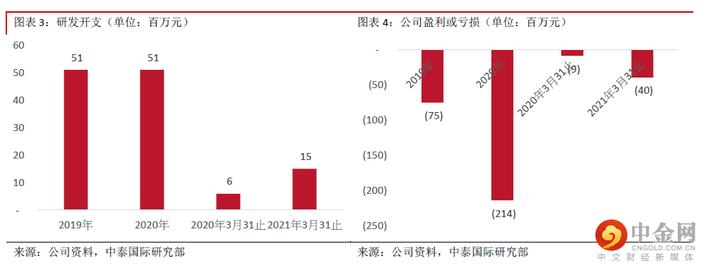 财务分析: 2020年及2021年前3月,公司收入分别为为1,456万元、1,362万元,毛利率为48.7%及64.7%。2019、2020年及2021年前3月的研发开支分别为5,111万、5,113万元、1,505万元;销售及分销开支为104万元、1,428万元、848万元;亏损分别为7,550万元、2.1亿元、3,980万元;年末现金及现金等价物分别为2,555万元、6.3亿元、1.8亿元。