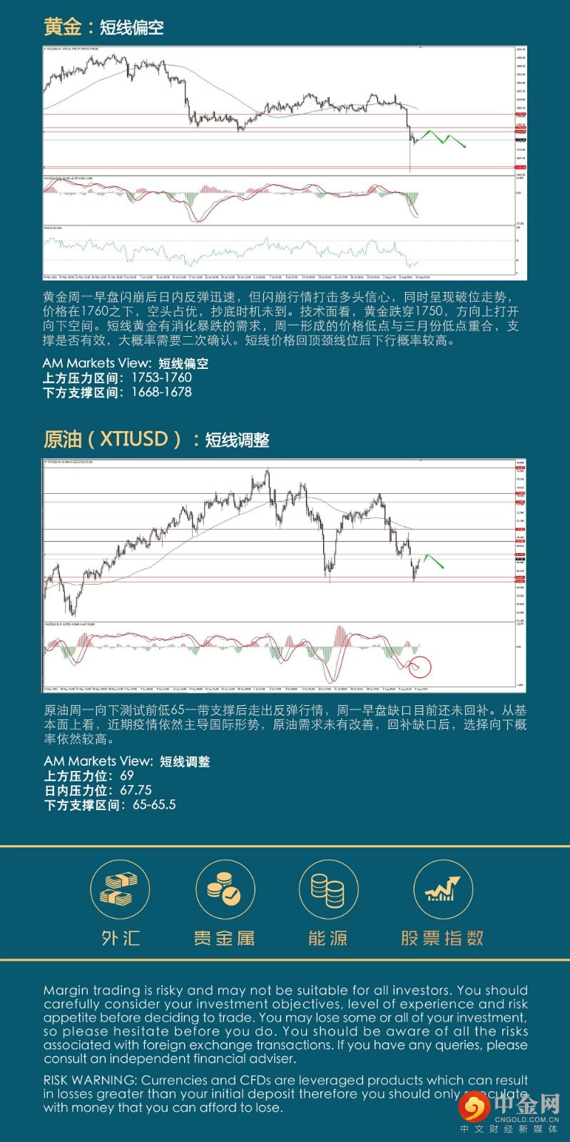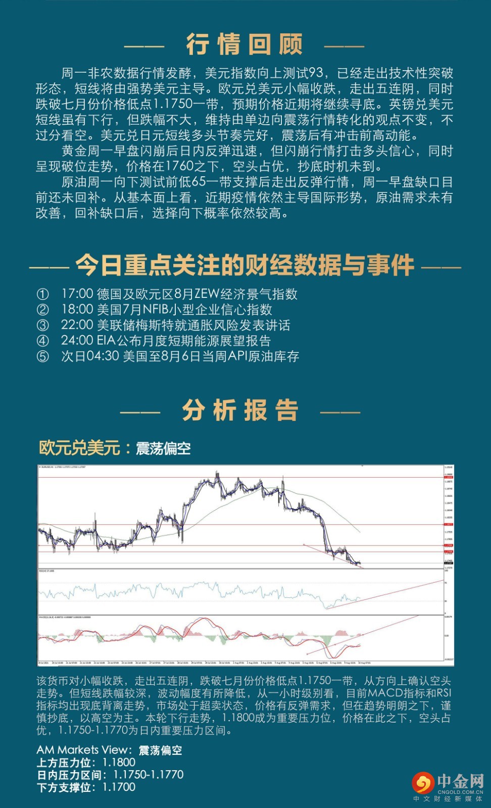 周一非农数据行情发酵,美元指数向上测试93,已经走出技术性突破形态,短线将由强势美元主导。欧元兑美元小幅收跌,走出五连阴,同时跌破七月份价格低点1.1750一带,预期价格近期将继续寻底。英镑兑美元短线虽有下行,但跌幅不大,维持由单边向震荡行情转化的观点不变,不过分看空。美元兑日元短线多头节奏完好,震荡后有冲击前高动能。 黄金周一早盘闪崩后日内反弹迅速,但闪崩行情打击多头信心,同时呈现破位走势,价格在1760之下,空头占优,抄底时机未到, 原油周一向下测试前低65一带支撑后走出反弹行情,周一早盘缺口目前还未回补。从基本面上看,近期疫情依然主导国际形势,原油需求未有改善,回补缺口后,选择向下概率依然较高。