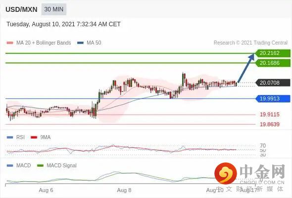 RSI 高于 50。MACD 为正且低于其信号线。该货币对可能会回撤。此外,价格高于其 20 和 50 周期移动平均线(分别位于 20.0676 和 20.0527)。