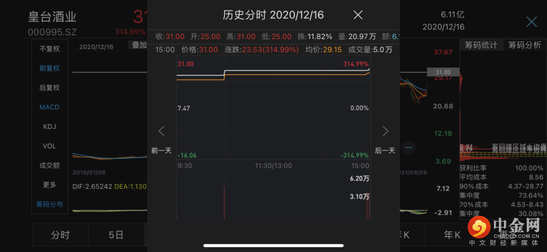 去年12月16日,有着“西北茅台”之称的皇台酒业停牌一年半之后摘帽复牌,复牌首日大涨314.99%,成为当日A股市场焦点。公开资料显示,皇台酒业成立于1985年,曾与贵州茅台齐名,有“南有茅台,北有皇台”的美誉。从进入资本市场的时间来看,于2000年登陆资本市场的皇台酒业,比贵州茅台还要早一年。