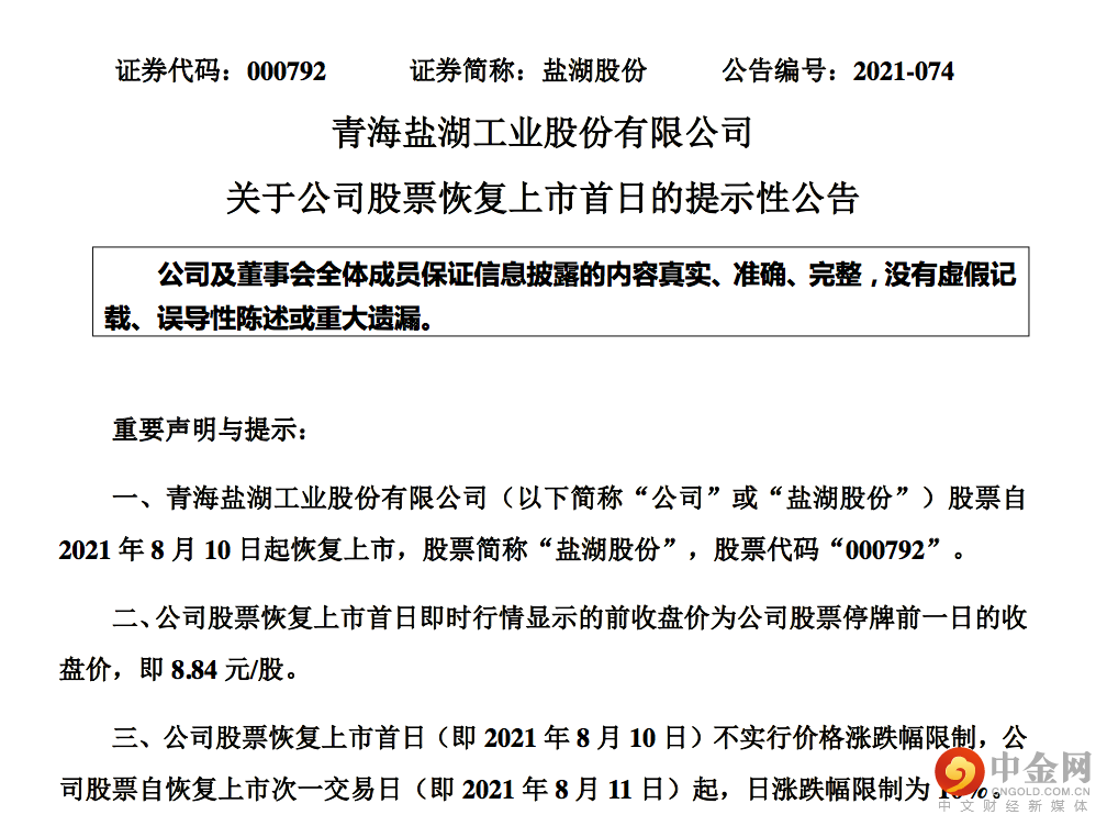8月9日晚,*ST盐湖发布公告称,公司股票自2021年8月10日起恢复上市,股票简称“盐湖股份”。公告显示,*ST盐湖股票恢复上市首日的前收盘价为公司股票停牌前一日的收盘价,即8.84元/股。恢复上市首日不实行价格涨跌幅限制,次一交易日起日涨跌幅限制为10%。