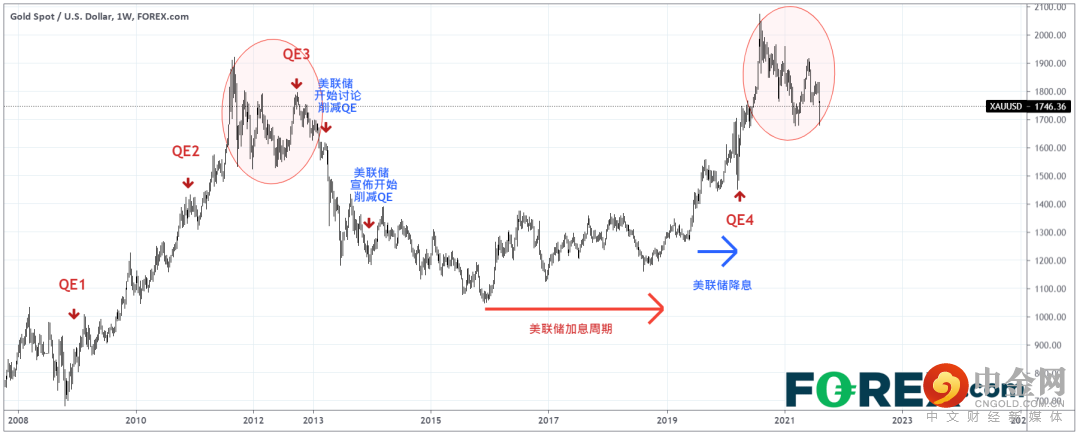 现货金价2008年至2021年走势与美联储局货币政策周期: