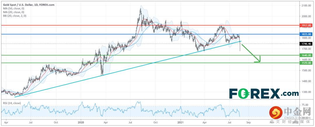 在日线图上,现货黄金的技术走势反转向下。此前它未能上破50日移动均线,现在跌破了2019年5月以来的上升趋势线。