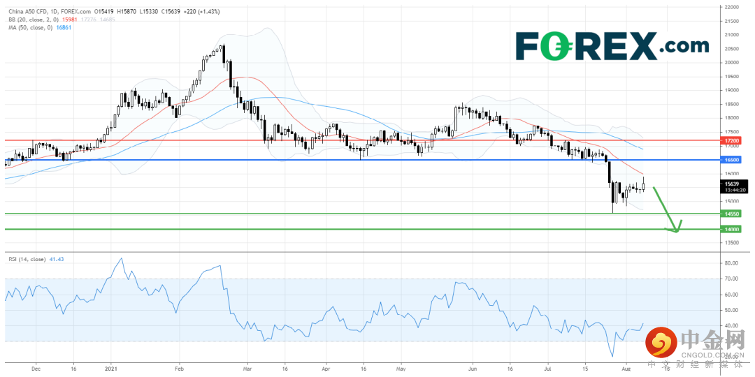在日线图上,中国A50指数CFD由7月低位反弹约2%,但目前仍在下行的20日均线之下操作。相对强弱指数仍在卖出区间30至50之间。