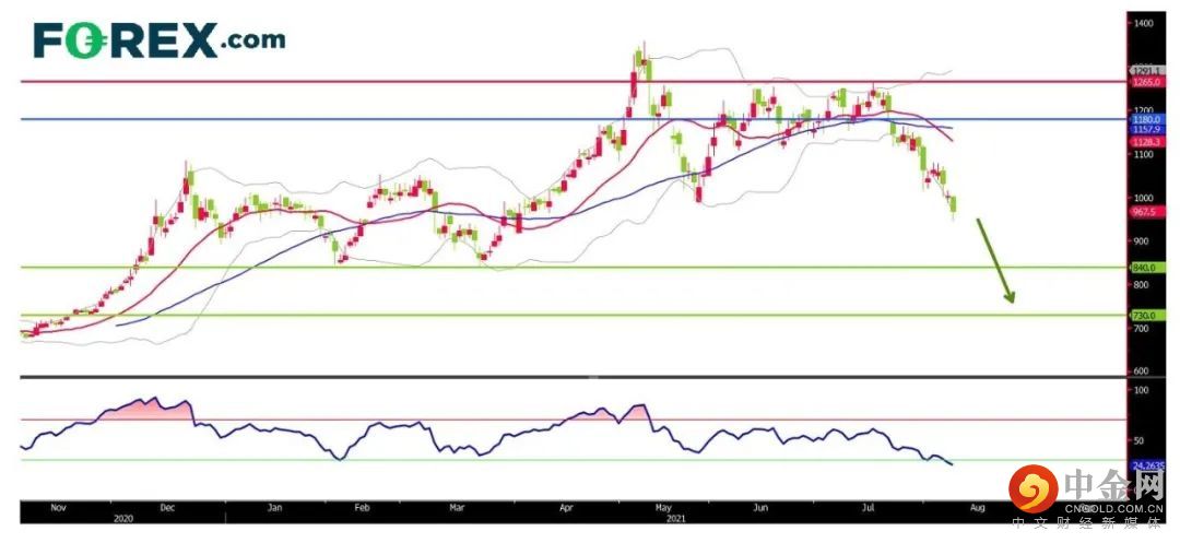 铁矿石期货价格已跌穿支持位985元人民币 (5月低位),正向另一下行目标840元人民币 (3月低位) 进发。