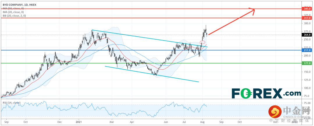 从技术角度看,如日线图所示,比亚迪股价上涨动能进一步增强。此前,它以缺口跳空上破1月以来的下降通道,并远离20日及50日移动均线。