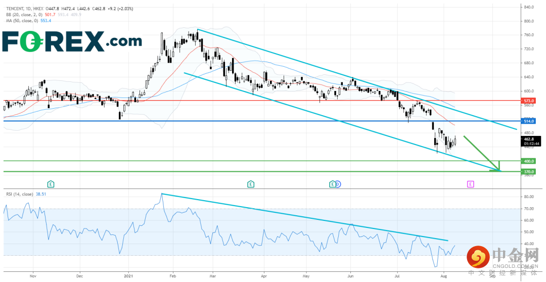 投资者可将主要阻力 (止损) 位设在514.00港元,下行目标则位于400.00港元和370.00港元。