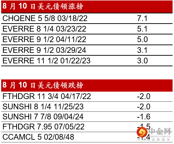昨日(8月10日)中国高收益债券市场延续前日强势情绪并由恒大领涨,公司考虑出售上市子公司的新闻传出后债券价格高开并持续上升,前端债券涨幅最大,较周一约涨5-7pts,长端价格亦有3pts升幅,公司通过资产出售来兑付短期的境外到期债务且短端债券涨幅较大与我们在8月3日发布的评论相符(可点击文章底下链接阅读原文),目前我们仍看好恒大/天基的短端债券。高流动性债券如佳兆业/融创均随较好的市场情绪上涨,分别收涨约1-2pts/0.5-1.5pt。其他BB评级债券如时代/龙光/旭辉整体收涨约0.375-0.75pt,主要受长线基金追捧和做市商空头回补,部分B评级债券如新力/花样年/富力的买盘仍较少。工业板块亦有显著反弹,宏桥24年到期债券收涨于102.5,较两周前的低点已有3pts回升。