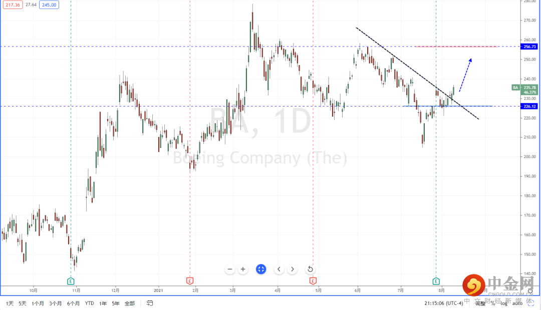 BA:从目前趋势的表现,价格在前期破位后收复失地。并且价格已经回到226.12一带。在近期小幅调整之后有效突破下降趋势的压制作用。整体转势多头已经确认,后期可关注价格调整后继续上行的多头机会,上方区间目标位置参考256.73一带。