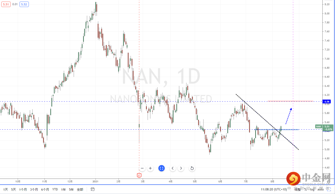 NAN:由于近期市场环境尚未得到明显的改善,趋于平缓运行中,但需要注意近日市场相关数据公布后的影响。从NAN目前整体趋势在下方长期筑底调整后起稳。并且价格也有效突破压制带5.51一带,以及下降趋势线的压制作用。多头格局基本成立,可适当关注价格调整后起稳上行机会,上方目标位置参考6.06一带。