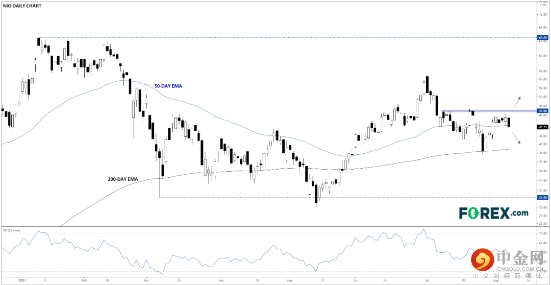 自从一季度急跌50%后,蔚来汽车股价过去五个月企稳于32-52区间。电动汽车领域早期投机泡沫整体有所消减,但蔚来汽车相对坚挺。股价在其略微上翘的200天指数移动均线处企稳,财报发布前每次下探该均线目前所处的40附近都有可能涌现支撑位。如果财报强劲,蔚来汽车股价有望站上近期阻力位47,后市有望上攻52。