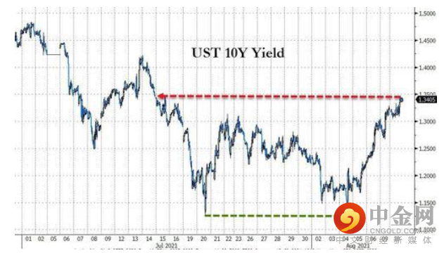 行情数据显示,指标10年期美债收益率周二纽约时段尾盘上涨2.5个基点报1.355%,创下7月15日以来最高。自从本月早些时候触及五个月低位1.127%以来,10年期美债收益率已累计大涨了逾20个基点。