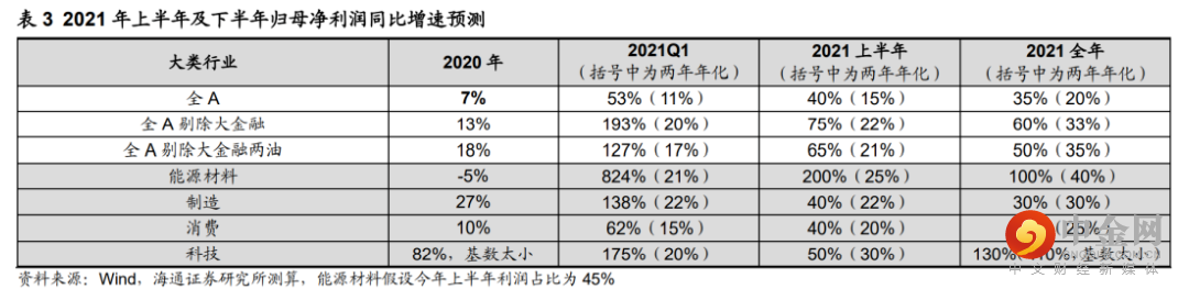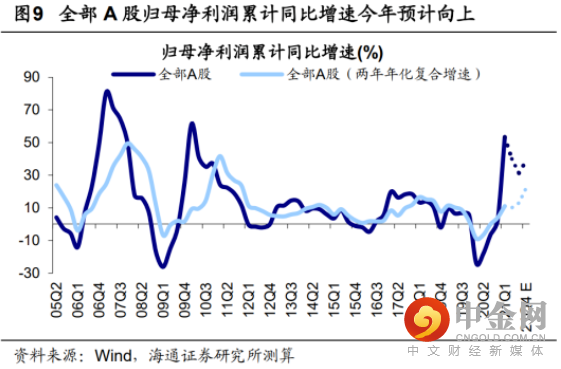 而根据已经公布的工业企业利润,海通证券预计全A归母净利润同比增速上半年为40%(两年年化15%),2021年全年为35%(两年年化20%);全A剔除金融后上半年归母净利润增速如前所述为75%(两年年化22%),21年全年归母净利润增速为60%(两年年化增速33%);全A剔除金融两油后的归母净利润增速上半年为65%(两年年化21%),2021年全年为50%(两年年化35%)。因此从基本面的角度前瞻,下半年市场有望继续向上。