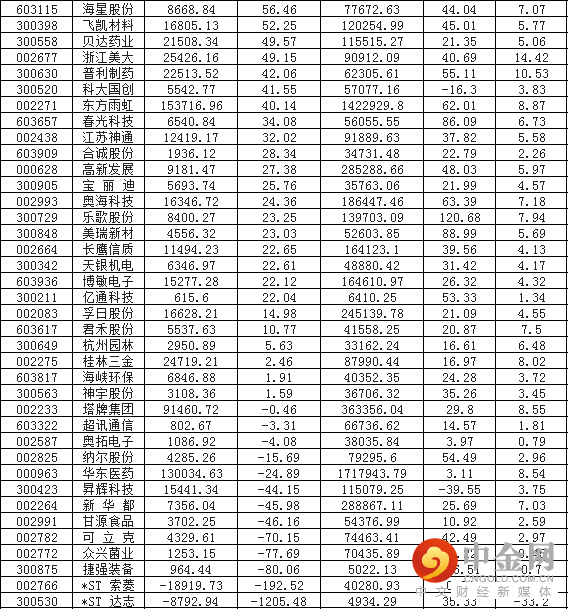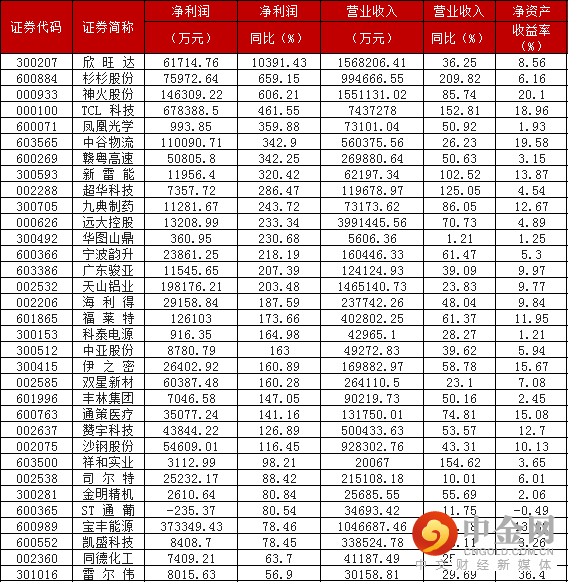 根据最新公布中报业绩的71家上市公司来看,净利润同比增长超100%的有25股,分别是欣旺达、杉杉股份、神火股份、TCL科技、凤凰光学、中谷物流、赣粤高速、新雷能、超华科技、九典制药、远大控股、华图山鼎、宁波韵升、广东骏亚、天山铝业、海利得、福莱特、科泰电源、中亚股份、伊之密、双星新材、丰林集团、通策医疗、赞宇科技、沙钢股份。