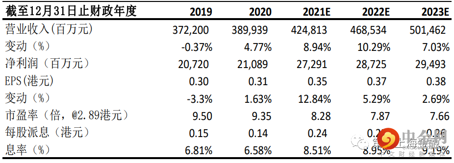 考虑到公司5G渗透率上升带来ARPU值较好增长以及公司保持产业数字化的高速增长态势,我们适当上调公司2021-2023财年的每股盈利预测2.83% /1.65% /1.97%,相应提升目标价格至3.9港元,对应2021-2023年8.28倍/7.87倍/7.66倍市盈率,较目前价格有35%的上涨空间,买入评级。