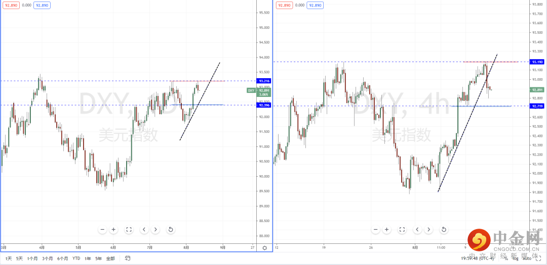 美元指数天图:短期趋势在冲击上方水平压制带93.216附近时继续受阻,虽然整体格局处于在多头阶段中,但趋势将进入阶段性调整。从日内4小时级别,价格在受阻后跌破上升趋势线,短期可适当关注价格测试下方水平支撑带附近的表现。