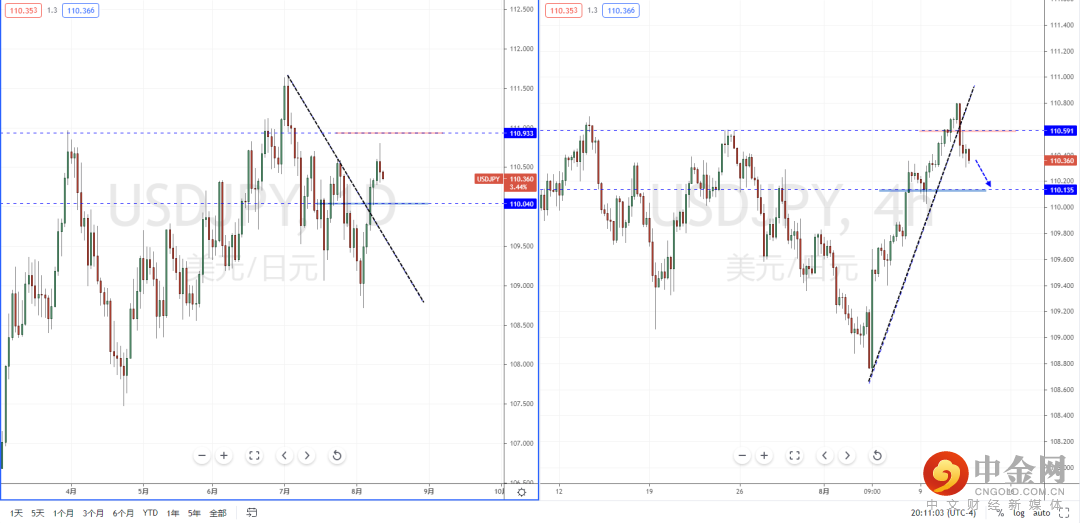 美日天图:短期价格在冲击上方水平压制带110.933附近受阻调整,虽然整体趋势趋于多头阶段。但从日内4小时级别,价格在短期回落至支撑带110.591附近受阻,可适当关注趋势继续下行测试支撑带110.135附近的表现。如果测试起稳后期可继续保持多头方向。