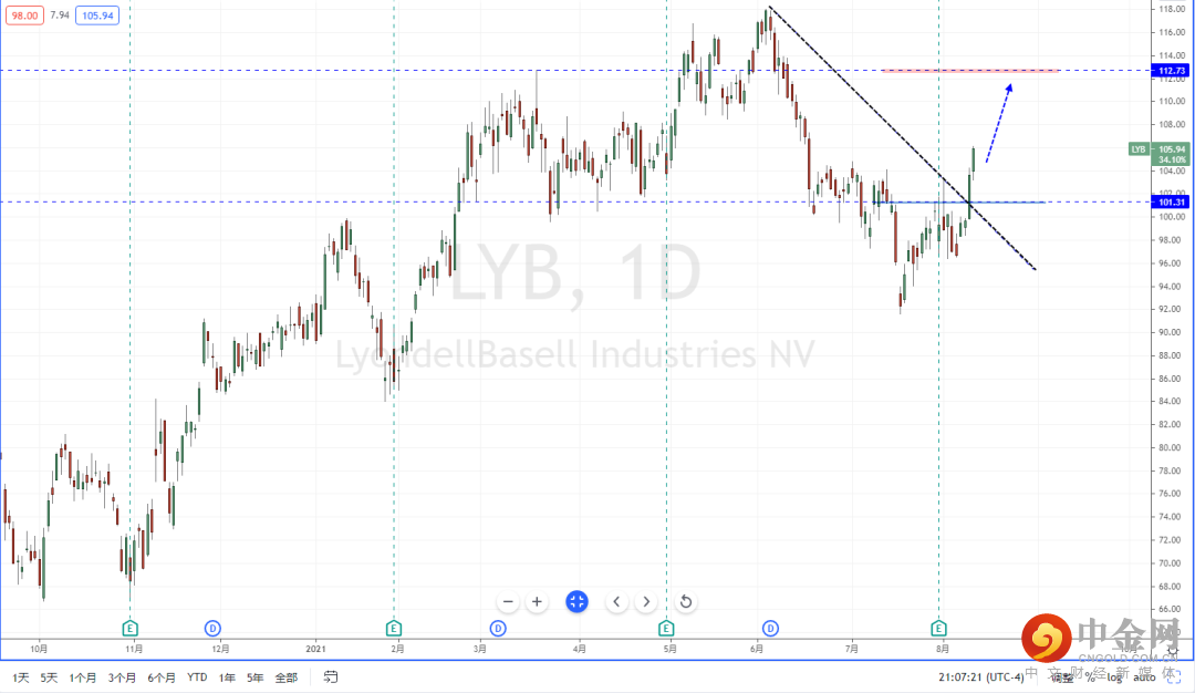 LYB:目前市场环境趋于利好,从ETF产业的表现也处于向上阶段。从LYB整体趋势在前期支撑带101.31附近纠结徘徊后止跌起稳。并且价格有效突破下降趋势线的压制作用后转势上行。短期可适当关注价格调整后的多头机会,上方区间目标位置参考112.73一带。