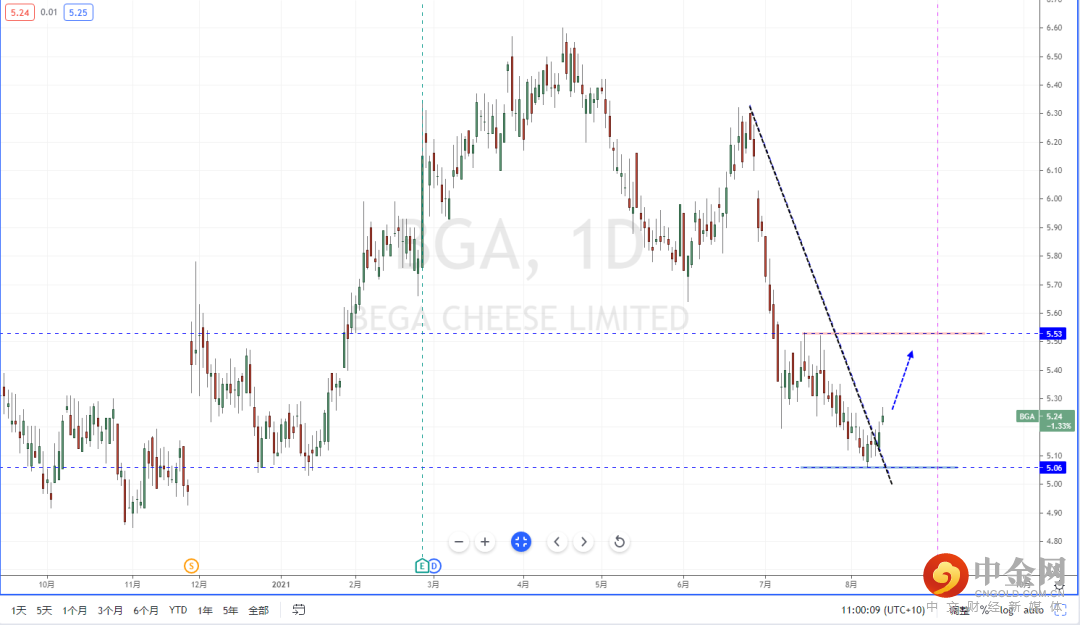 BGA:在近期市场随着相关数据影响,整体市场环境得到改善,从ETF产业的表现虽然存在分化,但也处于明显的上行态势。从BGA目前整体趋势在前期一路下行之后在关键支撑区域5.06附近止跌起稳。并且价格有效突破下降趋势线的压制作用,转势为多。近期可适当关注价格调整后继续向上的多头机会,上方目标位置参考5.53一带。