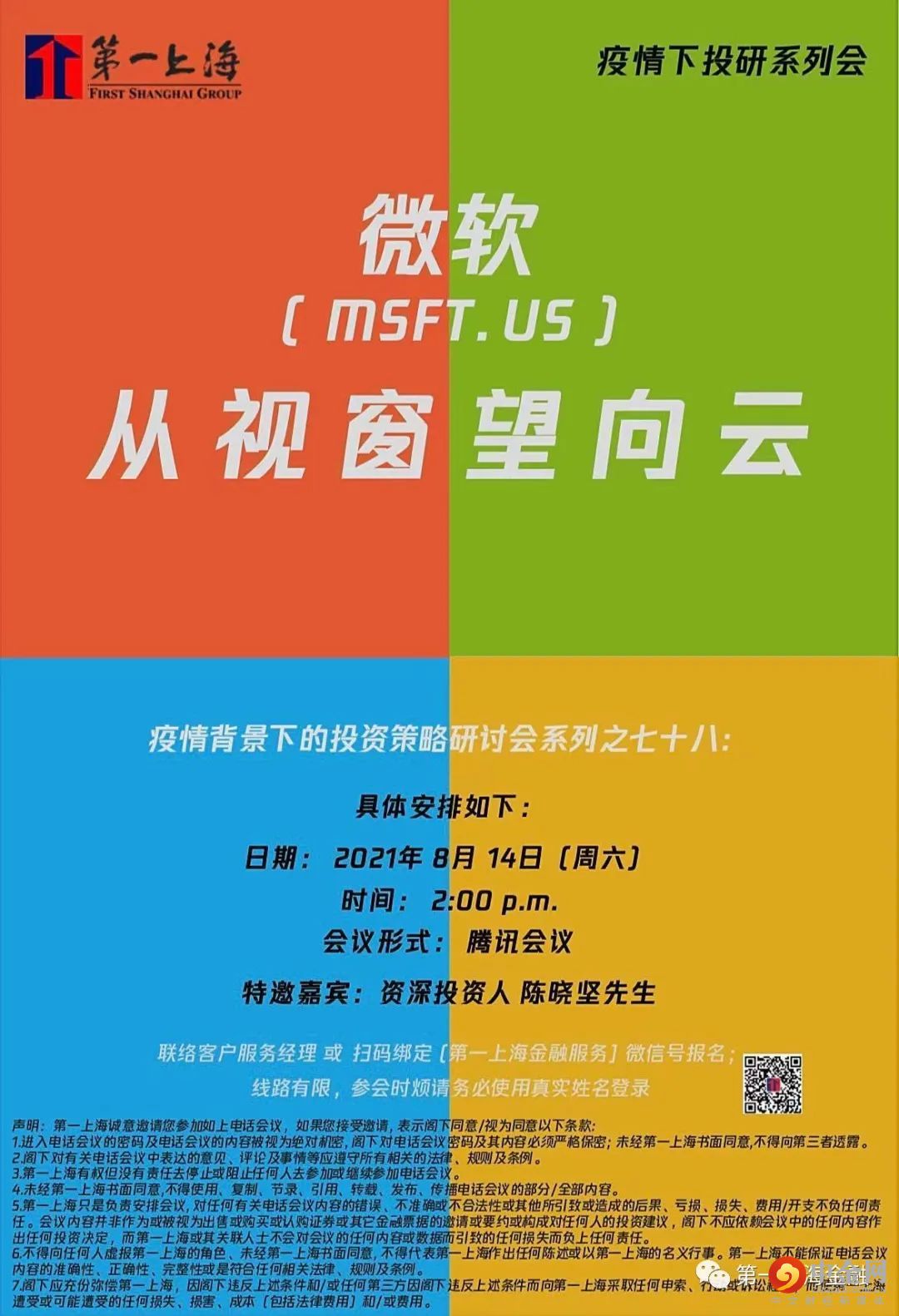 移动互联网时代,老牌科技企业微软(MSFT)有所错失机遇,但企业近年来重新启航,将资源聚焦于云计算。Windows系统也逐渐成为公司触达更多用户的手段而非增长核心。其中Azure与Office365已经成为公司云计算时代增长的重要动力,同时从微软生态中又孵化出Teams等一系列新的生产力软件服务。在各大互联网企业都纷纷争霸云计算的时代,微软的相关业务将如何独放异彩,第一上海投资论坛--“微软:从视窗望向云”交流研讨会将于2021年8月14日(星期六)在线举行。我们邀请到了资深投资人 - 陈晓坚先生作为客座嘉宾一起分享观点和讨论,欢迎感兴趣的投资者拨入交流!