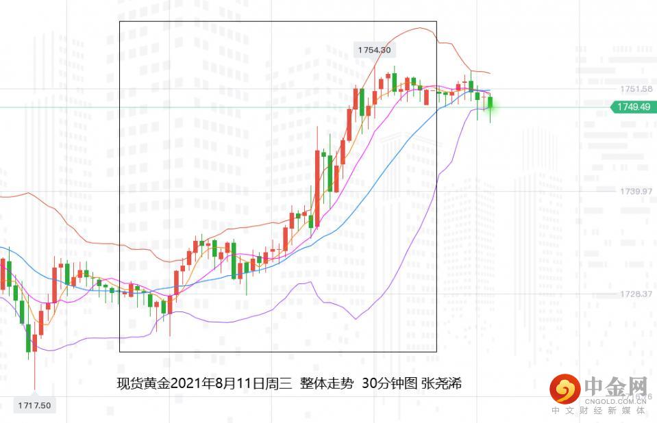美国公布的通胀数据消费者物价指数(CPI)放缓,缓解了市场对美联储将提前缩减经济支持措施的担忧。这打压美指及美债迅速双双回落,并支撑金价创出三个月最大涨幅,同时也录得日内高点1754.13美元,验证了晚间通知1730入场多单的目标位。最终触及5日均线压力有所遇阻,终收于1751.24美元,日振幅30.14美元,收涨22.33美元,涨幅1.3%。