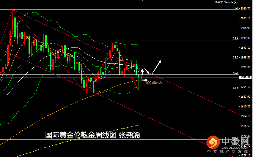 技术上,周线级别:金价继续延续本周一触底后的回升之力,目前虽未完全收复跌势,但也暂回归至100周均线上方,暗示多头已占据些许优势,如周尾能收线于此上方,则加大反弹力度,另外也从周一低点来看,正是触及1451-2075美元升势的斐波拉契61.8%回撤线支撑位置,同时还和3月份低点形成较强的双底支撑看涨形态,故此周线级别仍存在较大的反弹空间和预期。