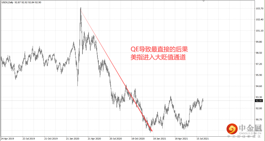 无限量的QE。放水虽然刺激了经济,但副作用也很大,比如说货币贬值、通货膨胀等。美元指数从去年3月的103.01点,一路下跌至今年1月的89.22点,不到一年的时间,贬值了13.39%,目前虽有所反弹,但从大周期来看只能算是贬值道路上的顽强抵抗。