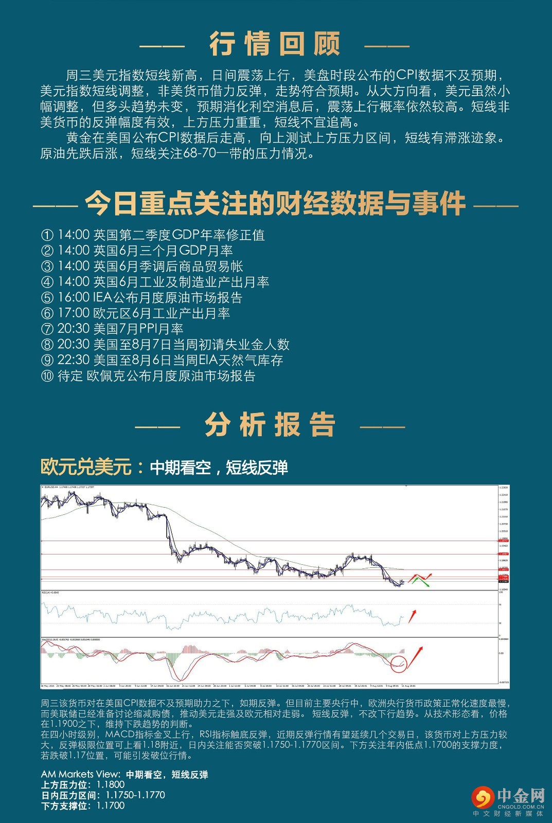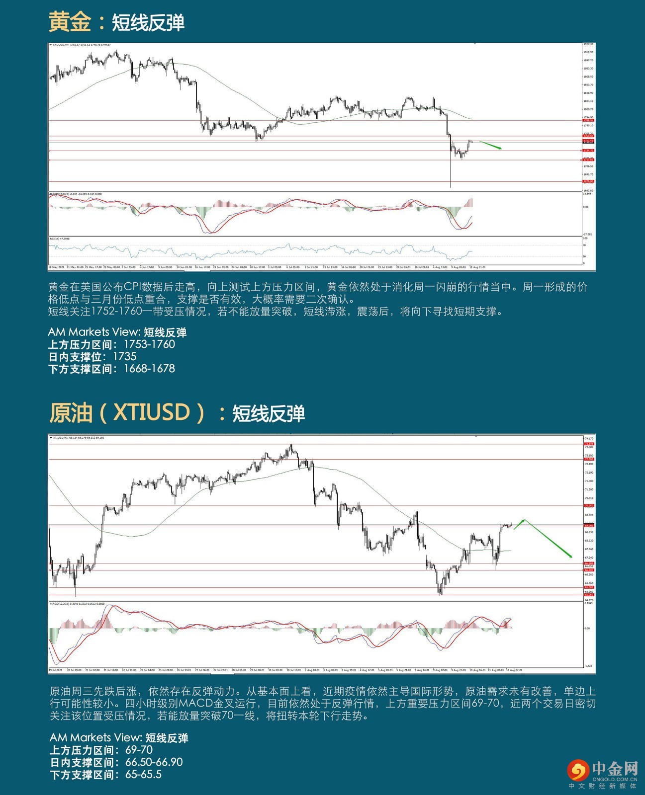周三美元指数短线新高,日间震荡上行,美盘时段公布的CPI数据不及预期,美元指数短线调整,非美货币借力反弹,走势符合预期。从大方向看,美元虽然小幅调整,但多头趋势未变,预期消化利空消息后,震荡上行概率依然较高。短线非美货币的反弹幅度有效,上方压力重重,短线不宜追高。 黄金在美国公布CPI数据后走高,向上测试上方压力区间,短线有滞涨迹象。原油先跌后涨,短线关注68-70一带的压力情况。