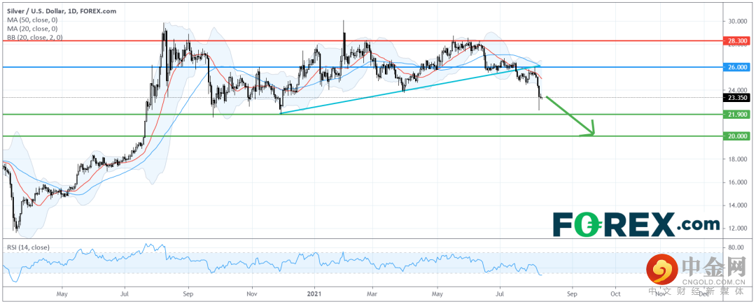 在日线图上,现货白银的技术走势开始转弱。它已跌破了去年12月以来的上升趋势线,并正在测试过去一年的盘整区底部。