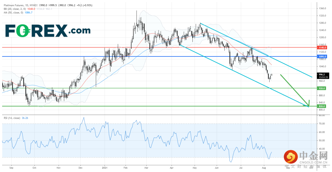 在日线图上,白金期货目前仍在下降通道内操作。下降的20日和50日均线都表示技术走势看淡。相对强弱指数亦处于超卖水平,指出下行动能强劲。