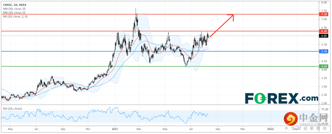 从技术角度看,如日线图所示,洛阳钼业股价仍在一个大型盘整区内交投。目前,它正在测试盘整区的顶部,20日及50日移动均线提供支撑。