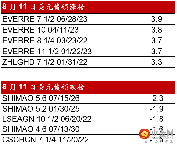 昨日(8月11日)中国高收益债券市场依然由恒大领涨,由于公司证实拟出售上市子公司部分权益,恒大/天基债券价格继前日收涨后再度上涨2-4pts,前端债券反弹至两周以来新高。佳兆业在强势情绪影响下收涨1.5-2pts,融创早上亦上涨1.5pt,但午后受到世茂消息影响升幅减少至0.5pt左右,其他高Beta债券有0.25-0.75pts的涨幅。世茂受到境内低价交易及表外负债等市场传言,长端债券一度下跌2-3pt,后反弹至下跌1-2pts。中梁债券价格受1.5亿美元私募债发行和债券回购亦上涨1-5pts。部分B评级债券如新力/花样年/荣盛等仍有较多卖盘。