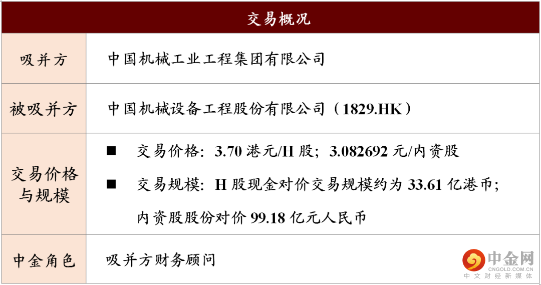 近期,中国机械工业集团有限公司(“国机集团”或“公司”)全资子公司中国机械工业工程集团有限公司完成以吸收合并方式私有化中国机械设备工程股份有限公司(“中国机械工程”)的交易。本次交易中,中金公司担任财务顾问。
