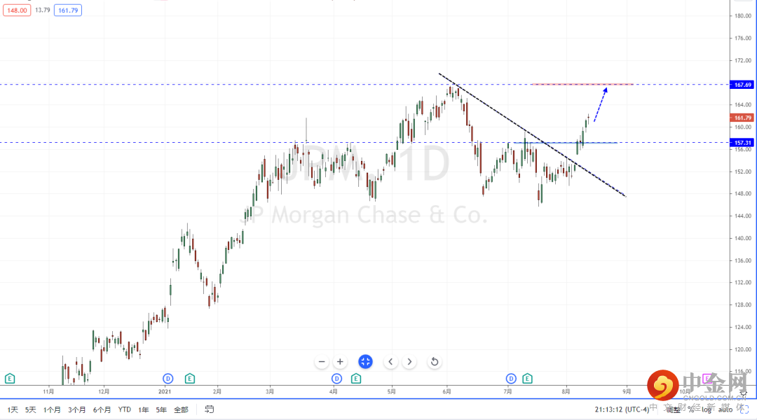 JPM:从近期市场的表现,在金融标的ETF相关产业持续向上后,带动相关性个股同步向上。目前JPM整体趋势在前期纠结之后一举突破下降趋势线的压制作用,以及水平压制带157.31附近,并且打开上方多头空间。短期可适当关注价格调整后继续向上运行的多头机会,区间目标位置参考167.69附近。