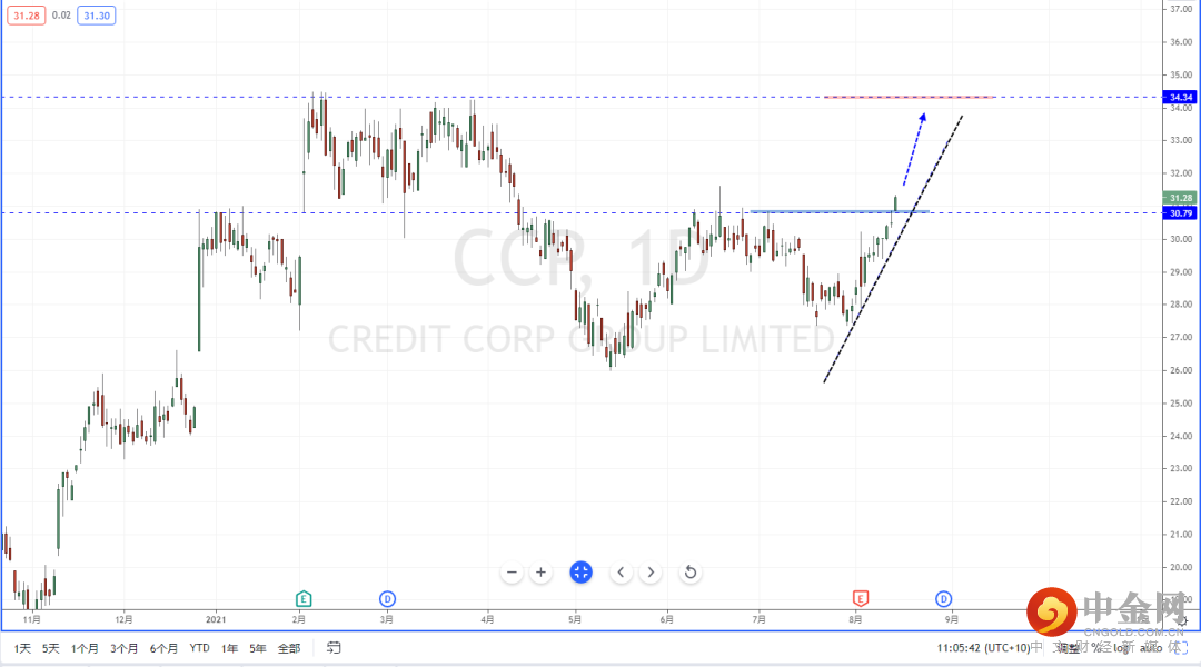 CCP:在近期市场环境趋于利好阶段,以及相关金融ETF产业也处于领涨上中,使得相关标的个股开始一波向上趋势。从CCP目前整体趋势处于在多头阶段中,并且短期价格坚决突破前期压制带30.79一带,同时也打开上方多头空间。短期可关注价格调整后继续上行的多头机会,上方目标位置参考34.34附近。