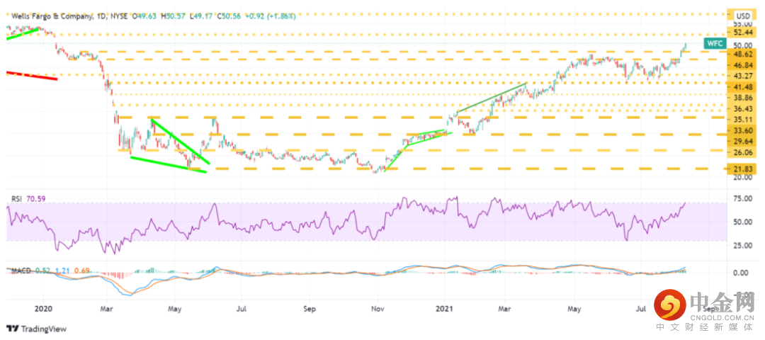 富国银行的股票需要微涨一些才能填补2020年2月的缺口。可能富国银行会填补该缺口,上涨如此之多而不这样做才会令人惊讶。