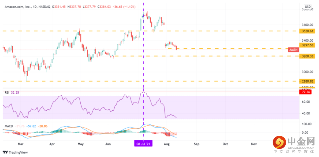 亚马逊今天跌破一个重要价格线,在跌破了公布季度财报后的低点并跌至3300美元下方。