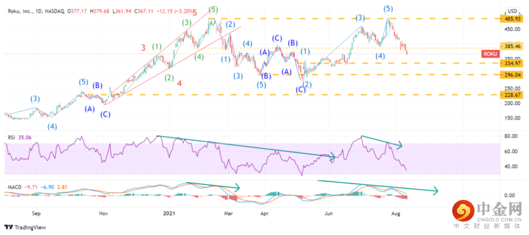 Roku公司的股票看起来像是形成了双顶形态。该公司的股票在财报公布后一直处于自由落体状态。